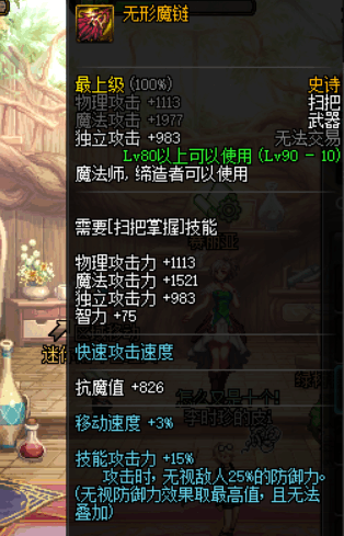 无形魔链其实单纯看属性,已经脱离了咸鱼史诗的标准,15%的技能攻击力,25%的无视防御的属性也是相当不错的,但是问题在于魔道自带减防,所以这把武器提升率并不能达到最理想化,其实无形魔链还有一个属性就是独立超高,单件装备加983独立,圣耀扫把和90自制扫把都是686独立,额外多了297的独立,提升率在10%以上。
