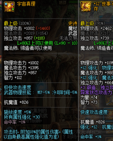 90史诗魔杖宇宙真理,30全属强和18%属性附加,这属性在90史诗武器中基本属于垫底水平,同样是18属性附加的支点,还有40属强和75~85技能等级+1的属性,但是上面就说过了,看装备不仅仅看下方的装备效果,我们还需要看武器面板,宇宙真理的魔攻是1395,独立是857。