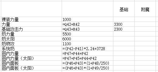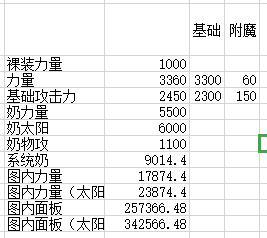 大佬们已经计算了系统奶的公式:2.24×A+3728(A为站街力量、智力-不穿戴任何装备时力量、智力),我们再假设带了一个荣誉+5500力量、+1100物攻的奶爸,太阳数据为6000力量,那么得出表格: