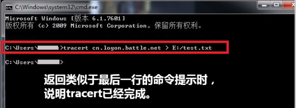 2、在命令窗口,输入tracert cn.logon.battle.net > C:/test.txt 并按下回车键