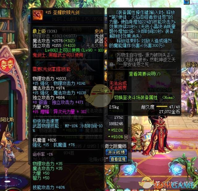 这位剑魂来自江苏2区,其左边身穿的是魔战套5件,手拿红彤彤的圣耀救赎光剑,95A特殊装备三件。魔战套剑魂,站街6049的力量,11万的物攻面板。剑魂身上的魔战套,被打造的很强势,鞋子是增幅15,其余的四件是增幅14,在跨五被誉为第一魔战剑魂。