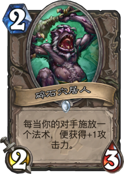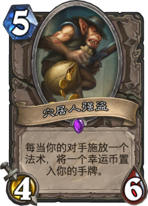 穴居人强盗的效果虽然看上去不是很好,在对方释放法术的时候只是多一个幸运币而已,但这个幸运币有时候也能起到很大的作用,要么连续刷牌,要么让卡组有多的费用达成OTK效果,所以面对它要释放法术的时候也有点虚。
