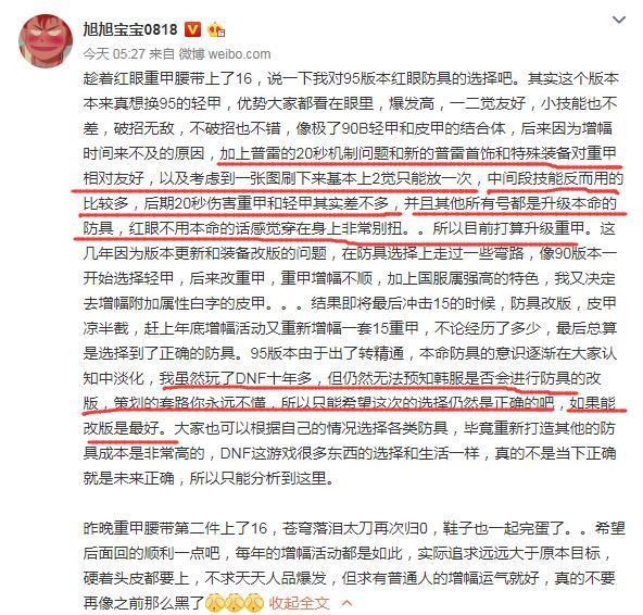 不过很多玩家也比较谨慎,打造武器还好,但是对于防具这方面,因为不知道接下来版本的走向,如果贸然打造出现不契合版本的情况,很可能竹篮打水一场空,于是很多DNF玩家都随着大佬走。在这样的局势之下,瓜皮君近日也发现旭旭宝宝刻意的解释了一下自己对版本的理解,并且给出了广大红眼玩家打造防具的一个方向。
