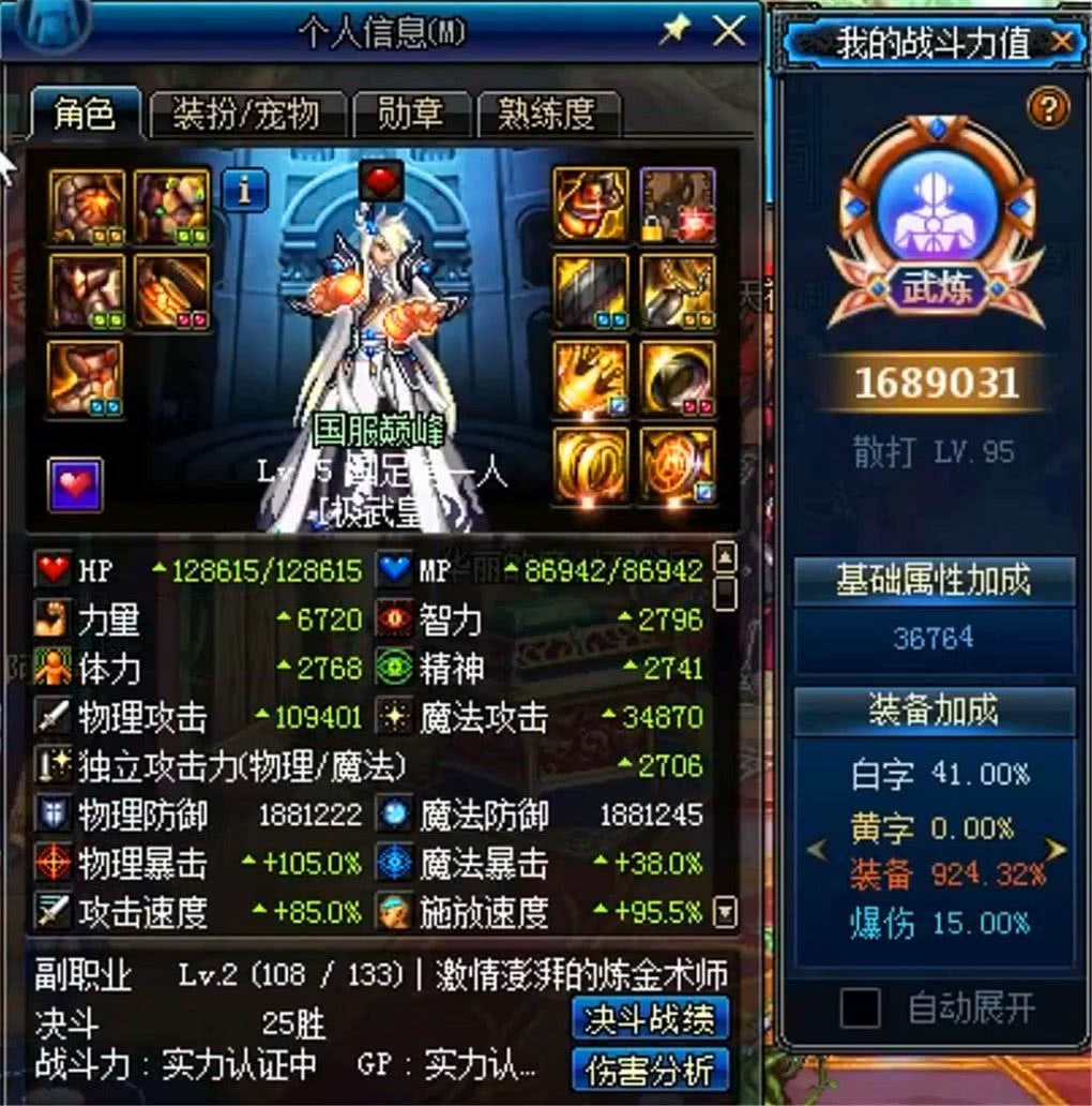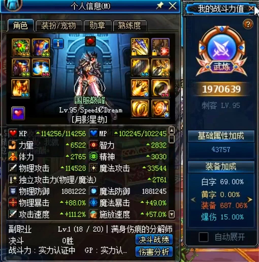 战力第二高的职业是刺客,除了武器是增幅15的苍穹匕首外,其他一身装备增幅14也是90版本毕业装备,但是面板已经非常高,差不多突破200万,有这样面板的刺客可以说屈指可数。