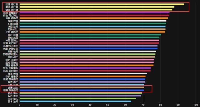为此最近WCL统计了目前版本在奥迪尔团本和大米职业的专精评分,并将其做成了一个榜单。奥迪尔团本榜单咱们先且不提埋个伏笔,先说说大米专精榜单,前三甲全是明晃晃的黄色职业盗贼,等于一个职业占据了大米输出前三的位置,而再看看排与末尾的职业们,奥法、射击猎就不说了,SS常年无门票也不算,增强萨和武器战这俩是个“神魔恋”职业。