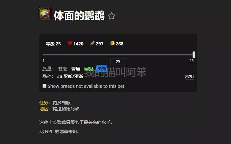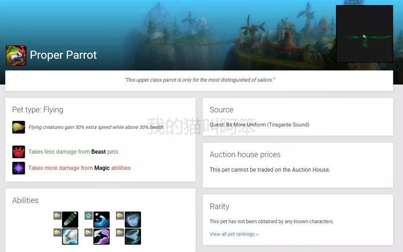 和其他没等正式服开放就已经取消、根本没在正式服上出现过的玩意不同,在8.1版本刚刚开放的时候,正式服上的宠物列表里是能看到体面的鹦鹉的。鼠标放上去的话,会显示体面的鹦鹉是提拉加德海峡的任务——更多制服的奖励。