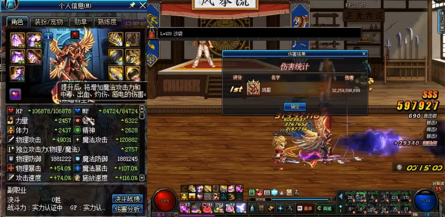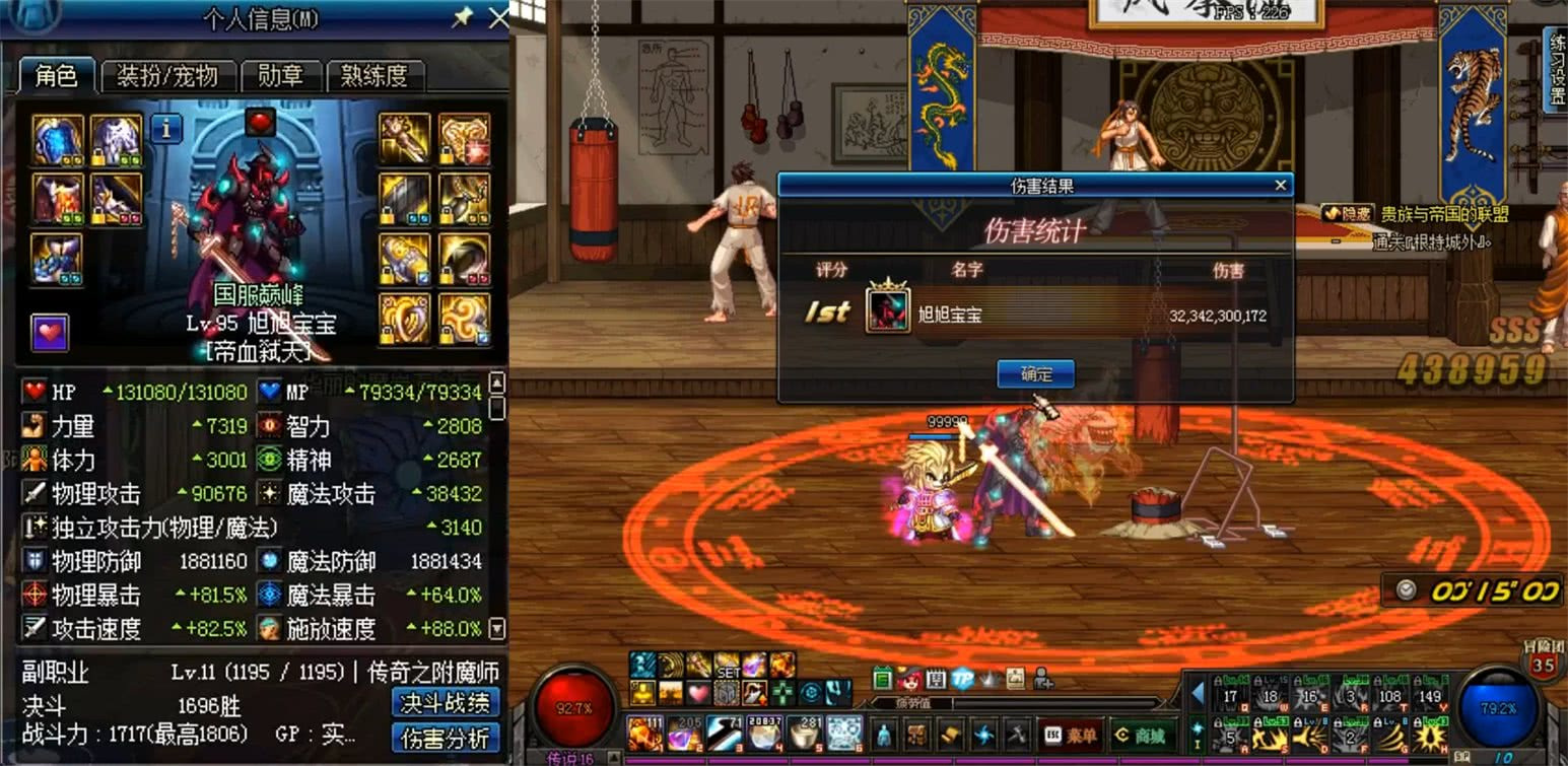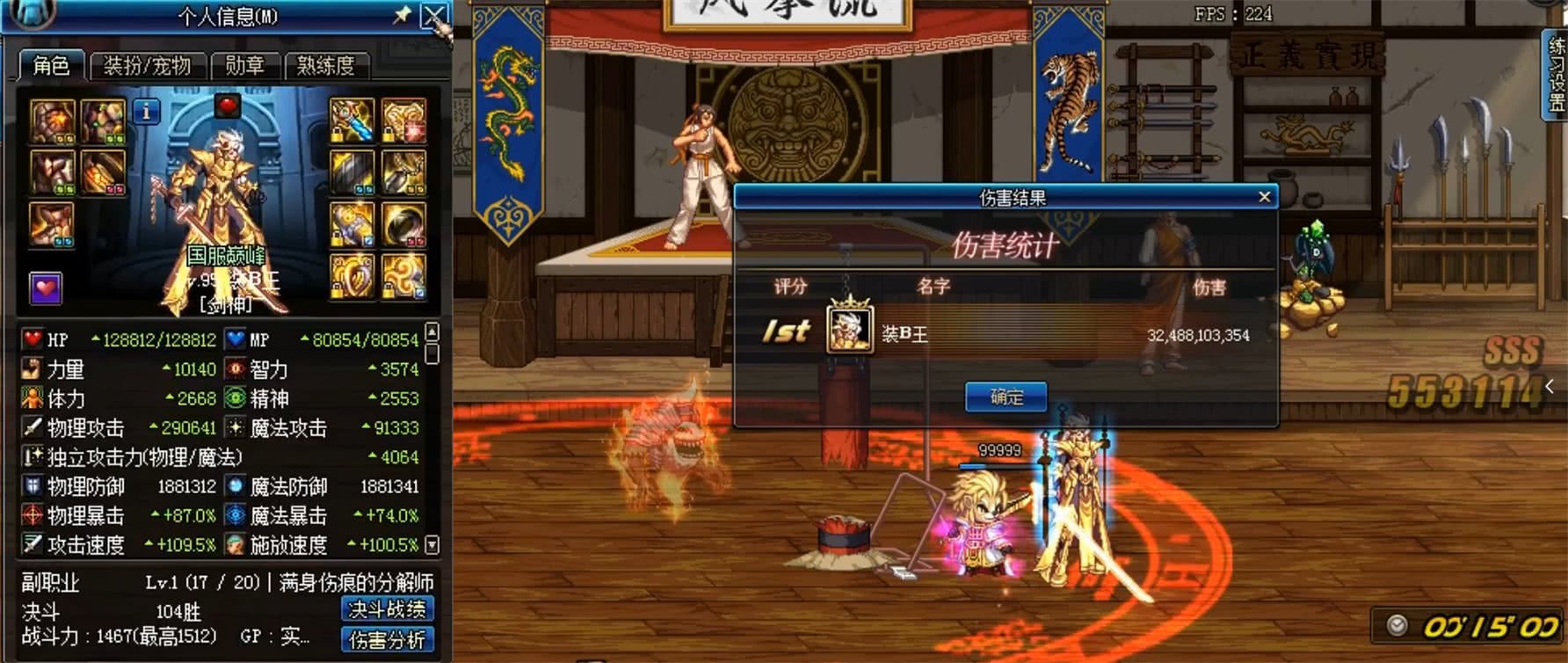 弹药的装备跟念帝有点不同,三神器还没有升级95A,但是其他都一样,一身增幅14,武器增幅15,在15秒沙袋测试的时候,最好成绩是243亿,屈居第四名。