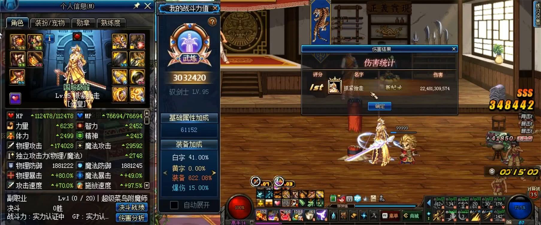 剑宗的装备和念帝一样,就不细说了,这个职业有一点好处,就是同等装备情况下,战力可以远超其他职业,不过最后打出的伤害也只有224亿,屈居第五位。