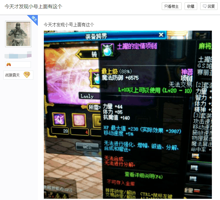 相信大家都知道有斗神奶这个说法,因为就像刚刚说的假紫混团的奶爸,提升说不定还不如一个斗神药剂。可以说奶爸大家到现在装备什么的都开发的差不多了把。在86版本的时候大家都应该是标准的寂静9,但是在90版本各种散搭奶的出现也是让个别传说价格疯涨,对于项链的选择可以说让很多体奶玩家着急,项链很少有加体力的,不动如山这个大家都应该是知道的,价格现在也是不低。今天这位玩家发现了一个新的加体力的项链,这就是土罐的定情项链。满属性应该是90多的体力吧。但是现在已经是绝版了。