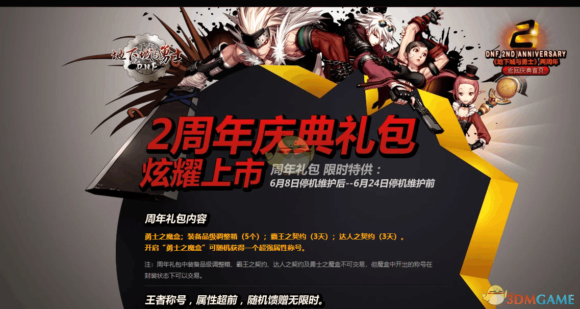 第二周年,DNF周年庆礼包炫耀上市,新增了王者称号跟套装专有属性,对比一下第一年,DNF算是真正的稳定下来了,走向了自己发展的道路,对于一些回归玩家也是赠送了遗忘河水滴(就在原先这个遗忘河水滴是真的珍贵啊,根本不像现在技能点可以随便加,真的是怀念啊)
