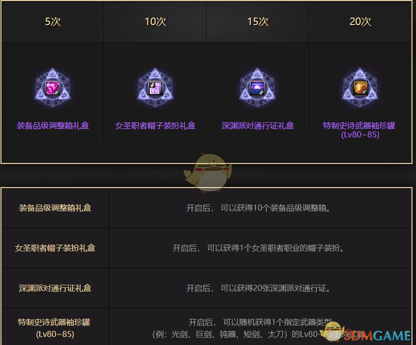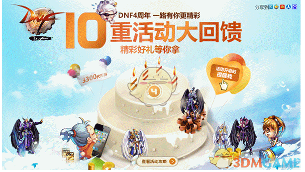第四年,DNF再一次开始了重头戏,在第三年站街和整点在线的基础上添加了送时装跟代币券的活动,而这同样为以后的活动奠定了基础,只要是重大活动,送代币券已经成为了事实(送代币券成为了事实,大家开盒子也变成了事实,然后就是一堆的欧皇出现)