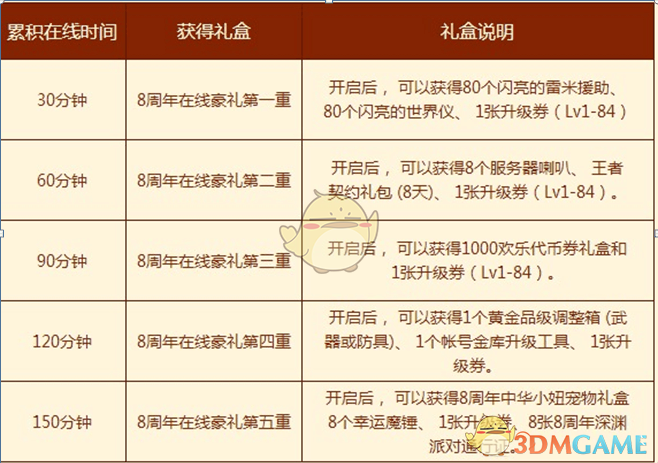 第八周年,没有了周年庆称号及宝珠,取而代之的是各种升级券、账号金库升级工具、黄金品级调整箱等等。八周年的活动采取的方式与七周年类似,活动不仅仅是在周年庆当天才有,而是持续近一个月的时间。每天都要站街超过3个小时,持续20天就可以获得一个80级的史诗装备跨界石,(当时为了这个站街,有多少玩家早早的登上账号,就是生怕挤不进频道)。