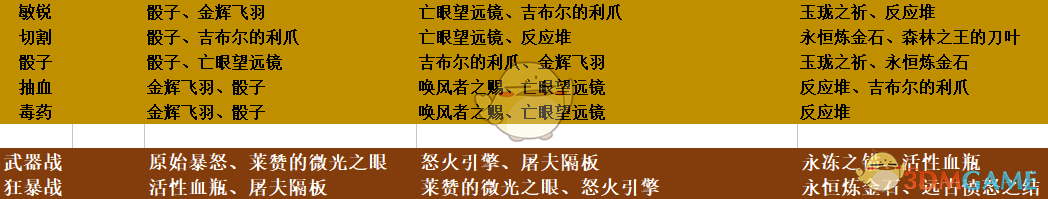 敏捷型DPS用吉布尔的利爪、骰子、望远镜和金辉飞羽基本效果都还可以;