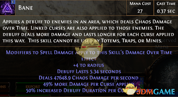 因为是混沌持续技能,而且混沌法术还有吃法术的特色,所以尽量寻找更多的法伤和持续伤以及混沌伤,而且3.5新加入了“非异常伤害的持续伤害加成”这个词缀,等同于是更多混沌伤害的词缀,非常强力,建议天赋装备上优先选取。词缀GGG已经重新定义了混沌持续伤害内容,范围伤害是无法加成给混沌持续法术的。所以集中效应是无法加成相关技能的持续伤害。