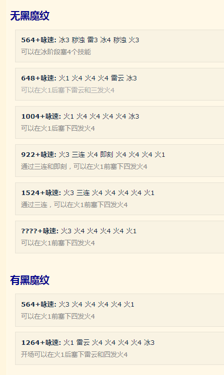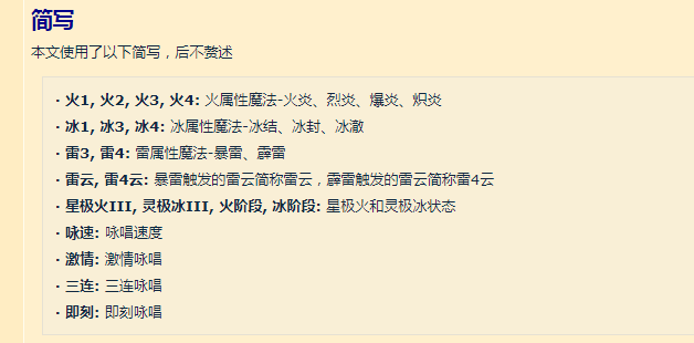 输出提升 黑魔没有带伤害的能力技,循环也非常简单。为了最大化输出,应该保持读条永不中断,并让移动和处理机制的损失降到最低。 插GCD和卡GCD 任何能力技能都存在着后摇,在后摇期间无法使用任何技能。大部分后摇大约在0.7秒左右(各种药水的后摇是1.2秒)。视延迟和机子的性能可能还会使后摇更长。 在咏唱一个不需要读条的瞬发魔法技能后等GCD转圈的时候插入能力技能,可以抵消后摇带来的负面影响。 在一个读条魔法后使用能力技能,会受到后摇影响而延后再之后的技能,也就是我们常说的卡GCD。 只要条件允许的话,顺滑的插入总是比卡GCD要好得多。对黑魔而言,在半咏唱的冰3/火3后可以插入一个能力技能,在瞬发魔法后可以插入两个能力技能。当然,如果你延迟很高,还是乖乖只插一个吧。 滑步 在读条快要结束的时候就可以移动了,这个时候移动也不会中断读条。时间上大约是0.5秒附近,同样受延迟和机子性能的影响。可以在木人身上来测试一下适合自己的滑步点。(译者注:我个人的方法是在准备确认的时候打打冰2,毕竟冰2不需要目标也可以读) 滑步可以用于短距离移动和没触发也没瞬发可用的场景。你可能仍然会在咏唱与咏唱之间略微损失一点时间,但总比不读条要强。 站位 许多机制实际上是可以提前跑位的,等到机制开始时再移动是既紧张又尴尬,可以用滑步或者瞬发技能悠闲的就位。 通常来说,最好呆在你队友附近。不光是为了让你的治疗方便奶到你,更重要的是能吃到队友的团队增益。 三连咏唱 三连咏唱最好配合火4使用。如果你卡GCD使用三连的话,三连带来的大部分增益都会被抵消。大多数副本三连都会自然对齐机制,如果不是特别需要留的话,都可以好了就用。 (译者注:以我个人5-8s的经验来说,三连转好了之后基本上几秒内就会有需要跑位的地方,所以好了就用大体都是没啥问题的。) 即刻咏唱 即刻对提高输出的收益不高,卡GCD用反而还会降低输出。一般来说可以捏着它用来移动/应急/处理机制。 (译者注:当然,作为一个有追求的黑魔,肯定还是融入输出最好。) 黑魔纹 黑魔纹应该转好了就用。就算用不满黑魔纹的时间,也比整场战斗少开一次黑魔纹要好。 处理机制的时候一般都可以在黑魔纹的边缘试探而不用彻底离开。如果实在需要离开的话,可以在瞬发魔法期间内短暂出去一下,再用魔纹步回来。(译者注:比如7S开场放雷球,可以详见我的视频) 以太步 以太步用来处理短时间内的长距离移动。如果滑步或者提前跑位能解决的事情,就不要用以太步。 传魔的使用 假如队伍里有诗人的话,起手传魔可以让魔人歌持续的更久一些,起手后传魔则可以让下一次魔人歌提前,跟团队和诗人沟通来决定怎么使用吧。 不要在冰3转冰后立马使用传魔,否则你自己会卡蓝。在火3转火前使用(即使火3前打个雷云)同样伴随着少蓝打6发火4的风险。其实就意味着传魔通常都要卡GCD释放,但能让魔人歌延长或是加速使用还是值得的。当然,如果治疗缺蓝的话,就算有损失肯定也要硬着头皮乖乖传魔去。 示例 起手传魔 (卡GCD)
