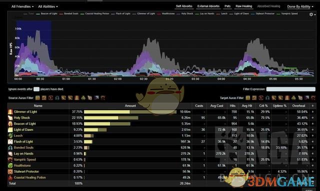 闪烁流会有和震击几乎相同数量的手电筒,虽然廉价但是手电筒全程依然可以提供10%左右的HPS,不可忽视。大多数情况都是过量的,当做填充剂打出即可,即使过量也可以看做是对道标的一次单抬。