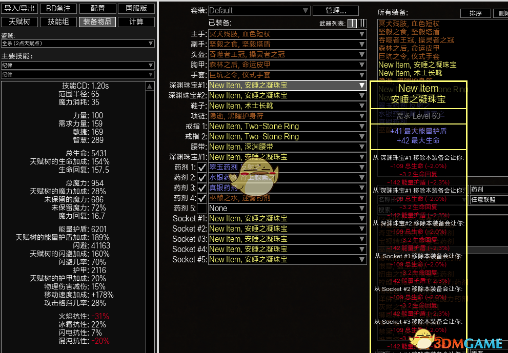看到有人询问能有多少ES和HP,用POB模拟了一下,黄装都是选取装备T2或T3级别的血量和ES,值得注意是移速吃药有175%以上,闪避有40K,被击中回复5%ES等于是2K的ES,黄装部分没抗性,不用看POB的抗性