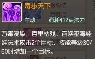 毒步天下:万毒浸染,百里枯残,召唤巫毒娃娃法术攻击2个目标,技能等级30/60时增加一个目标。