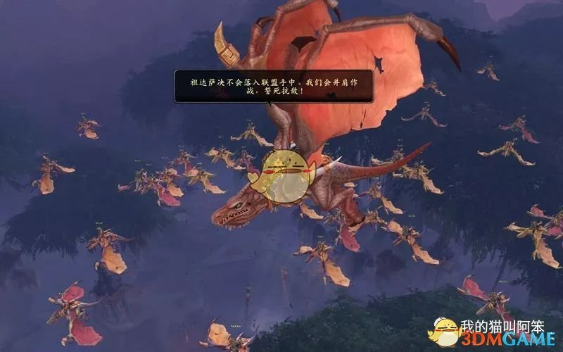 随后骑乘妖术领主拉尔身旁的飞翼领主前往纳兹米尔与祖达萨的交界点一同支援公主,来到这里可以看见联盟的士兵和部落的士兵正在战斗,之后我们需要从剑圣特拉蒙手中救下洛坎,并消灭15个联盟士兵。