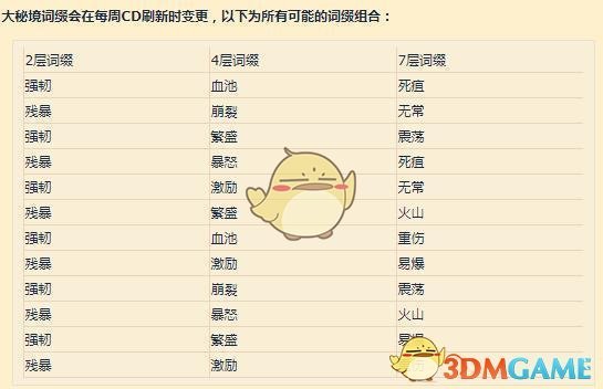 大秘境词缀会在每周CD刷新时变更,以下为所有可能的词缀组合: