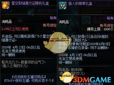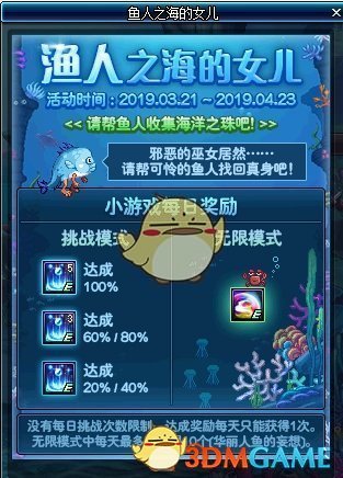 累计18天通关小游戏后,可开启无限模式,每天可从无限模式获得10个材料-华丽人鱼的妄想,奖励有1件海伯伦、无属性且无法分解或合成的鞋子装扮(注意:和挑战模式的鞋子装扮名称不同)、1年的水滴伤害字体。