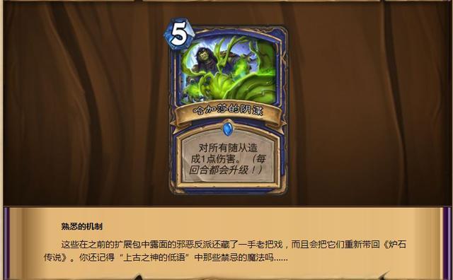 快攻卡组我们都很熟悉了,其精髓就是在最初最短的几个回合内对敌方造成致命的打击。为什么说阴谋牌实际上是针对"快攻卡组"的阴谋呢?从"哈加莎的阴谋"上我们已经看到了,对所有随从造成1点伤害。(每回合都会升级!)