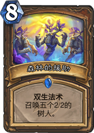 德鲁伊这张森林的原著给我的第一眼就是太蠢了,8费5个2-2的树人,我还以为官方还要强推树人德,然后我就看到了这个双生法术,我就觉得完全不是一个级别了,我觉得天梯依然不是很强,但是竞技场里,解场牌本来就不是很多,但后期双方随从都跟不上速度的时候,如果你摸到这张卡,你可以有两次铺场的机会,不管是解场还是进攻都是相当不错的卡,而且这个双生法术让我想起了上个版本的牧师卡,增生手臂,有一点点像啊。