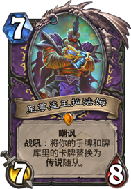 我先说一下第一张新卡,术士的拉法姆,这个卡的效果和黄金猿一样,我不评论效果一样是好是坏,但是直接变传说这个战吼可以说是相当厉害,在竞技场强度相当的情况下,一回合一个传说卡,而且传说卡大部分都是身材比较大的随从(不要说什么全是钓鱼王逗比啥的,毕竟只是偶尔才会出现),竞技场里面一回合一个大个传说随从可以说是明牌胜利了。天梯的话效果一般,第一术士的过牌速度很快,摸到的话手牌牌库也不是很多了,根据场面等等因素也不一定按时下这张卡,第二就是这张卡及时变身,如果对面是控制法之类的随从,依然可以依靠龙妈等反场赢的胜利,所以我认为这张卡在标准天梯的表现并不会很好。