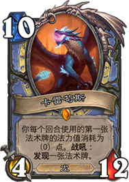 下一个就是新版本这张卡雷苟斯,10费4-12,战吼发现一张法术牌,还可以直接用,这种随机性在控制法中还是相当不错的,不光可以救命,并且这张卡的光环效果使得你可以每回合0费放一个法术,但如果有法师带的话,也只能是控制法了,但控制法真的需要这张卡么,打快攻基本用不上,拖到10费的话也基本上你你赢,打慢速说发现炎爆的话我们也可以自己带一张,我觉得这张卡并不属于那种花龙点睛的卡,更属于锦上添花的卡。因为这张卡并不具备核心卡牌的条件,但是打一些卡组还是可以取得不错的效果的,4-12的身板对于一些卡组来说也不是很好就可以解掉,我觉得强度还算可以,还是要看新版本实际评测。