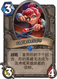 破咒珠宝师的效果很局限,天梯中你说防冰法或者无线火球,我觉得依照现在这两种卡组过牌等速度,第一你不知道对面哪一回合斩杀,对面让一回合也无所谓,如果是挂上武器的奥秘法,确实可以起到防范的效果,在我眼里局限性还是很大,拿狂野来说,法师并不是很主流,而无限火球和冰法只是占一部分,奥秘法占多数,而你单纯想要防这几种卡组带一张这个也不能起到很好的效果,拿标准来说,也只有无线火球,而无线火球的数量也寥寥无几,这个时候你还想要在你的牌库中塞一张这个卡么。