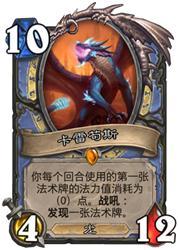 但是这次的法师的梦想龙似乎真的有梦想!尽管10费4-12的身板似乎不那么美好,但是它带有一个战吼和光环效果,只看这个“大屁股”的光环效果就有点吓人了,每回合免费使用一次法术,第一回合也可以使用。也就意味着但这个卡雷苟斯站场后你可以使用AOE来清场,一但站住了,威慑力丝毫不比它的父亲-玛里苟斯的小。