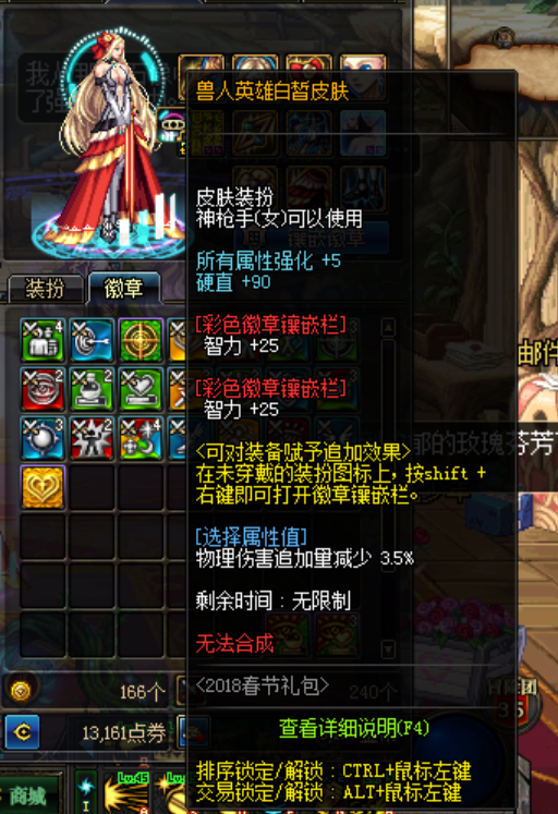 装扮的属性一般就是光环、武器装备、皮肤和时装了,武器装备没啥好说的,都一样。光环和皮肤,那这里就推荐国庆光环和春节皮肤了,因为这两个是可以打徽章了。4个孔就可以打4个25力量或者智力的徽章,就可以比普通的光环皮肤多出来100点四维了。国庆光环还可以增加30点双攻和45点独立和1-50级的技能,而皮肤可以增加属强,去年增加5点,今年增加6点,这些都是细节方面的提升。