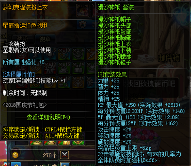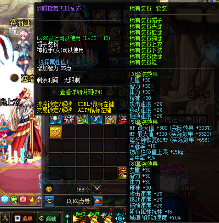 然后是魔法职业了,魔法职业天空装备要选择头发和帽子装扮,可以增加55点智力,然后脸部和胸部随便选一件。上衣也是国庆上衣,增加6点属强,下装也是国庆下装,20点智力。然后另外三个部位选择高级,因为高级时装三件套也是有套装属性的,可以增加10点四维。天空的多一点,可以增加30点的四维。