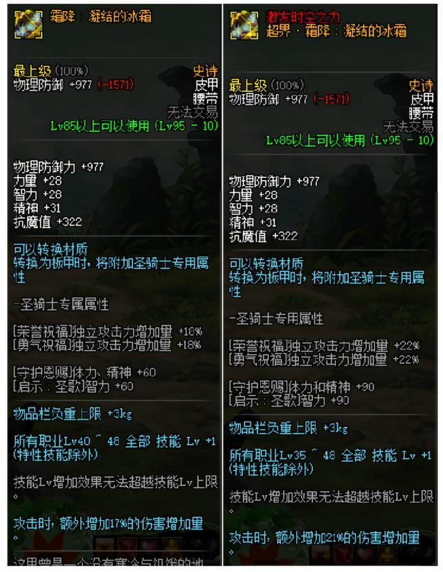泰波尔斯皮甲腰带-霜降-凝结的冰霜,未升级超界前的属性是增加1级全职业40到48级的技能等级,17%的追加黄字伤害;升级超界后的属性是增加1级全职业35到48级的技能等级,21%的追加黄字伤害。