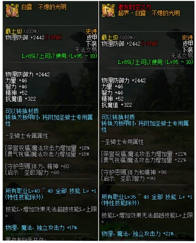 泰波尔斯皮甲下装-白露:不息的光明,未升级超界前的属性是增加1级全职业40到48级的技能等级,增加物理、魔法和独立攻击力17%;升级超界后,增加1级全职业35级到48级的技能等级,物理、魔法和独立攻击力增加21%。