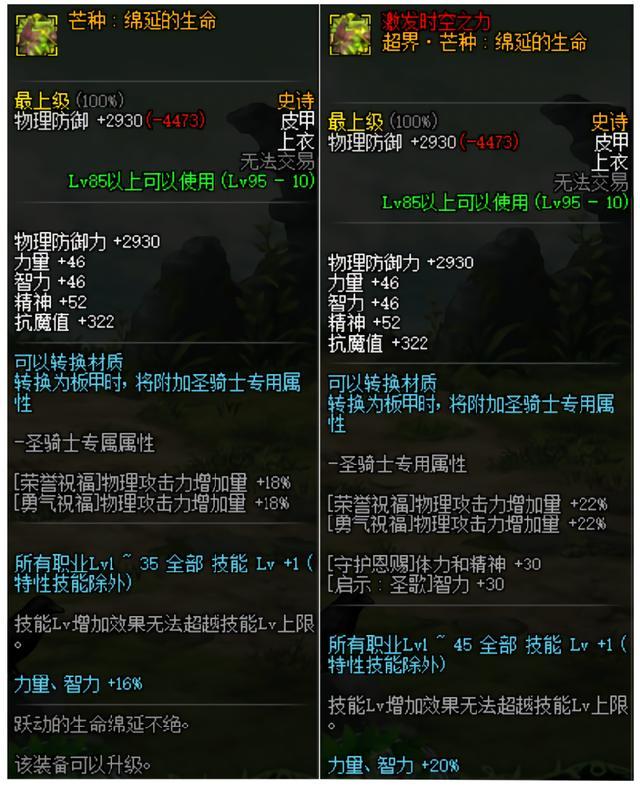 泰波尔斯皮甲上衣-芒种:延续的生命,没有升级超界前的属性是增加1级所有职业1到35级的技能等级,力量和智力增加16%;而升级超界后的属性是增加1级所以只有1到45级的技能等级,力量和智力增加20%。