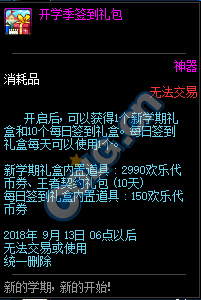 每个账号限购买1次,只能使用点券购买,开启后可获得1个[新学期礼盒](2990欢乐代币券+王者契约礼包10天)&10个[每日签到礼盒](150欢乐代币券,每天只能使用1个),累积可获得4490欢乐代币券,欢乐代币券将于2018年9月17日更新维护后统一删除