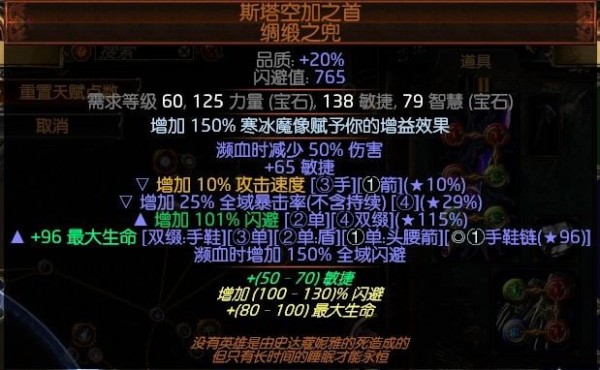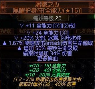 项链屠戮之心,非常多的所有属性,带50%偷取速度,可以节省掉活力虚空的3点天赋,同时吸血状态还提供30-40%inc。考虑到能节省3点天赋,这条被人万年唾弃的猪仔项链远比一般的点伤双暴黄项链要好的多。PS:一定要用20%抗性的。PPPPS:物理偷取没有用,偷取靠的是纯才珠宝。