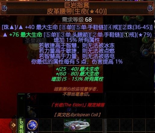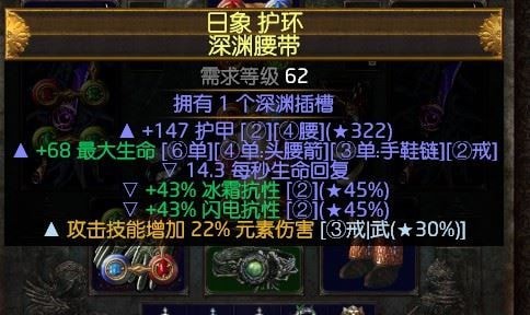 这个造价高,除了憎恨三相以外还需要一颗4级启蒙。但这还没完,我需要在4件首饰中凑出200多点抗性,并且让它们都对齐。(这个过程从梳理思路到淘装我花了两天)而且因为预算问题,我4件首饰上只有腰带上带有22%inc,戒指满足抗性的基础上带点点伤生命就行了,项链至少暴击暴伤点伤生命,有穿透最佳。如果预算10E一个戒指腰带,我至少还能在提升20%more吧。