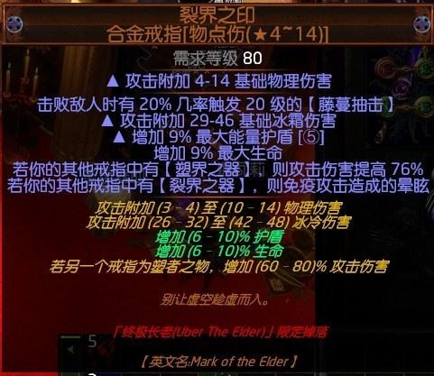 戒指衣(满溢之甲)恒定最大抗性80%并且免疫地图上的穿透抗性词缀。聪明的欧克(药剂),三抗对齐之后提供所有元素15%穿透和10%元素减伤,对裂空大剑来说无论攻守都是一个飞跃性的质变!这个搭配比常规75%抗性上限多28%的元素减伤,如果你的生命基础不低,那么戒指衣肯定比大血甲肉。