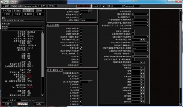 这是我过渡时候的配装,除了一个塑界底的戒指全是暗金!所以要开元素净化不开憎恨。严肃说,这套配装并不是来开玩笑的,因为属性值通过长老腰和塑界手之间相互放大收益,这套其实很实用并且造价低,POB有300W秒伤。