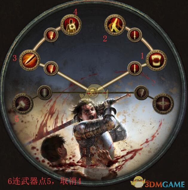说明:下图为武器6连的天赋图(图中忘了修改的BUG:取消霸体,前提条件要有击中致盲,拿这一点去点生命5%)