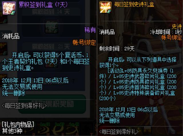 每日签到史诗礼盒,我们看到礼盒中的描述,大家可以自选1个85史诗防具永久兑换券,应该是考虑到还有玩家没有全部升级永久史诗而增加的选择项目,不过我的小号缺的好像是五张,哈哈。