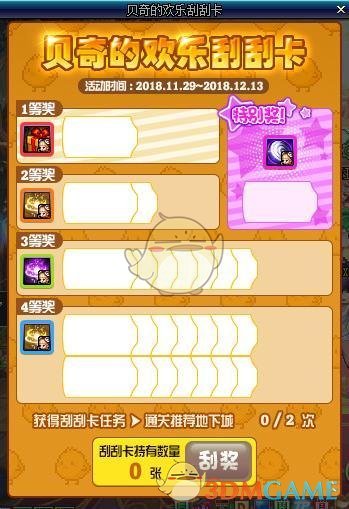 活动时间是2018年11月29日到12月13日,我们每天通关推荐的地下城可以获得刮刮卡,通关2次地下城会获得1次机会,每天。并且也能在贝奇商店购买这个刮刮卡,一次150万一张,目前没有看到有数量限制,如果没有限制,那么这一波土豪玩家可以考虑用金币购买了,特等奖每周都能开出来吧,看来金币的价格真的要稳定在目前1:35左右了。不过大家看到获得所有奖励后会获得特别奖,意味着我们特等奖是获得其他奖励后必定获得的,这样我们就需要获得1到4等奖,然后就能获得这个特别奖的奖励了,看起来好像变得更人性化了一些吧。刮奖板每周四更新一次,活动总共2周,奖励大家最多获得2份。