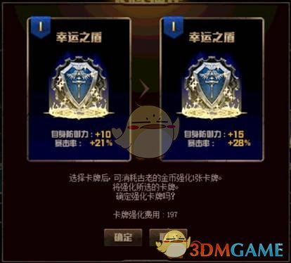 这是什么意思呢?比如下面的这张卡牌“幸运之盾”在强化后的防御属性会增加5点,而暴击这种辅助属性则增加7点。