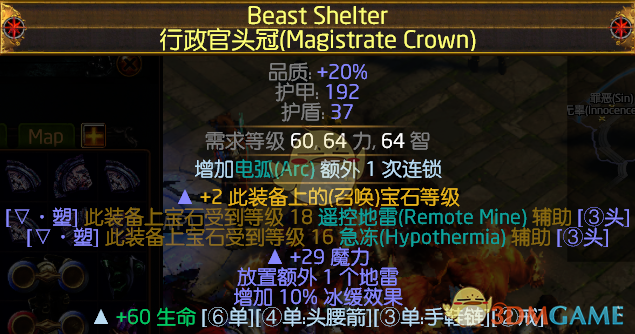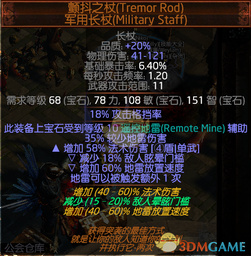 电弧(21级)+遥控地雷(矿杖自带10级) +陷阱(1级都行)+陷阱与地雷伤害+精准破坏+闪电穿透+附加闪电伤害