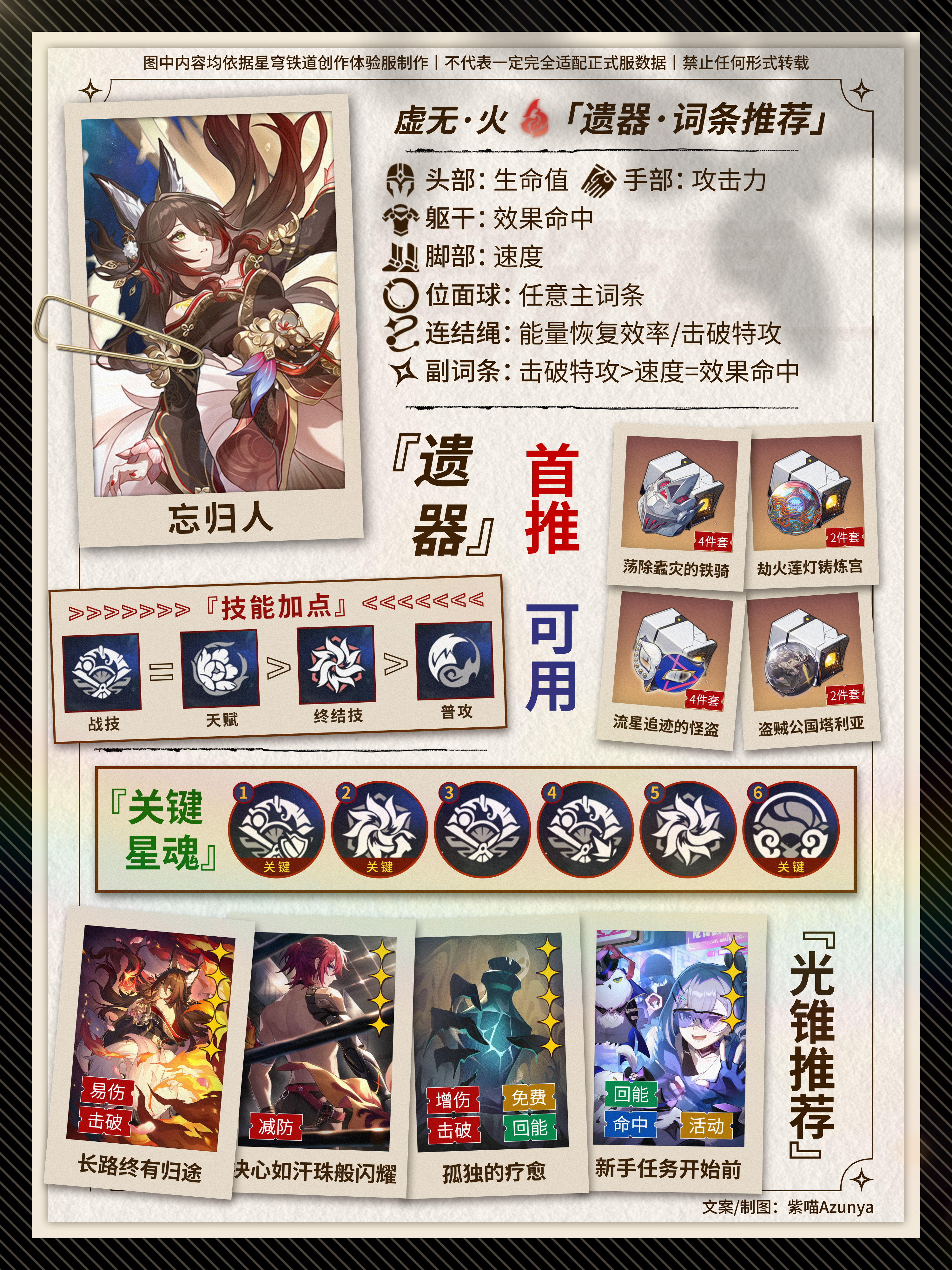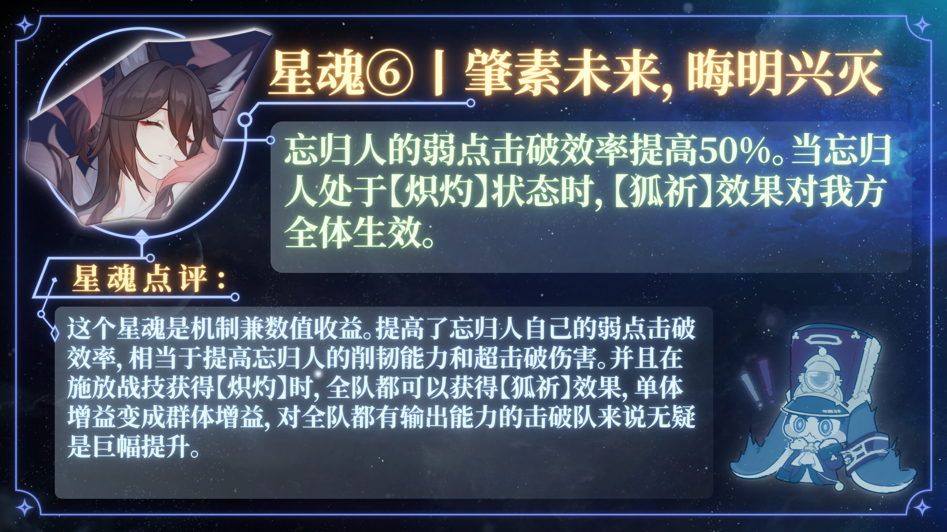 ①星魂1是击破队特供增益,击破效率是击破队较为重要的属性,有预算的击破队玩家可以考虑拿下。非击破队玩家想拿用忘归人的其实0魂就够,除非想抽2魂否则不建议单独抽1魂。