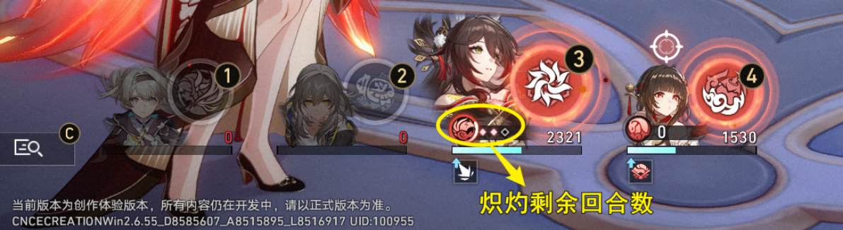 ⑤【炽灼】的剩余回合数会显示在角色头像下方的特殊机制栏中。