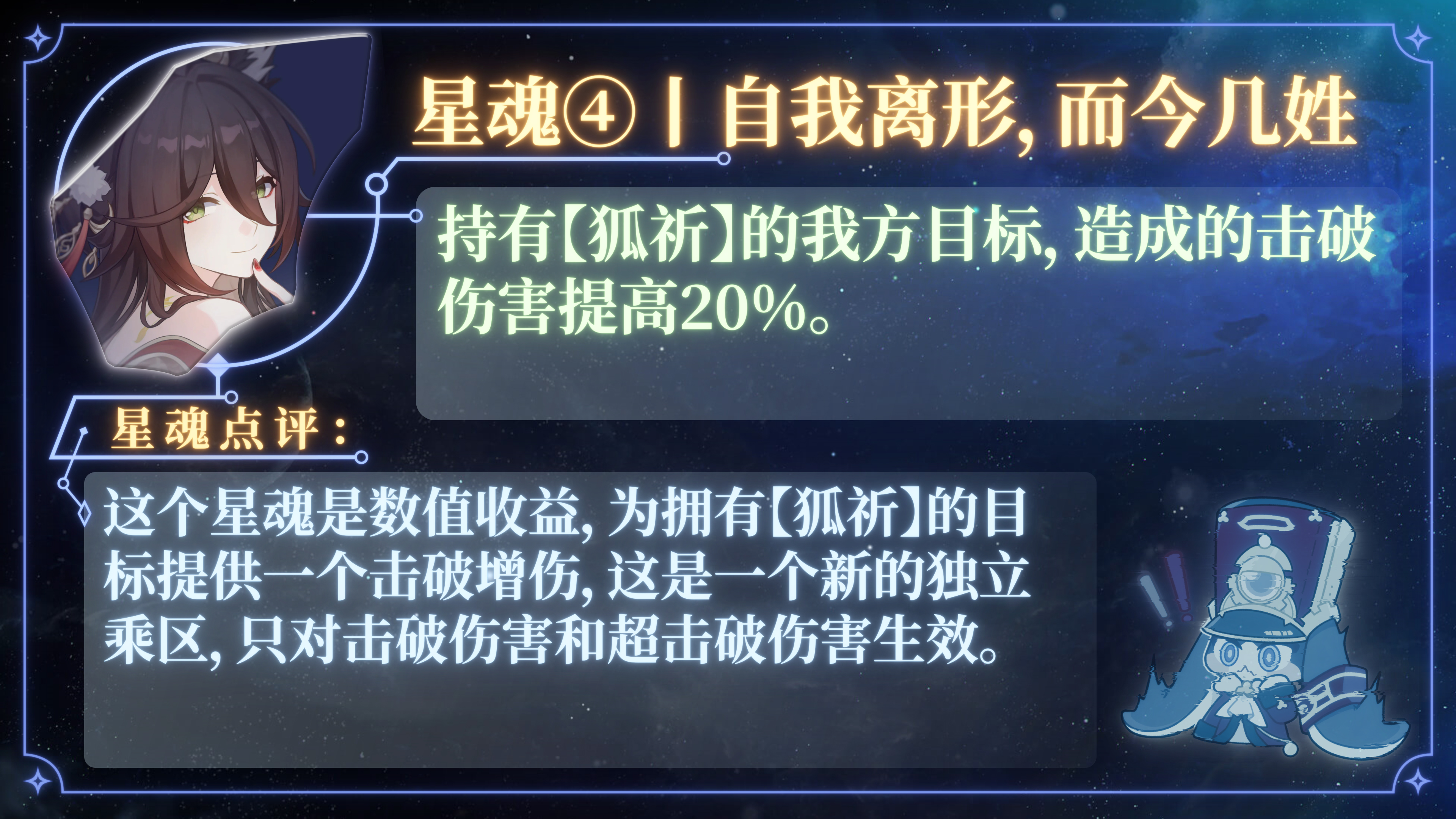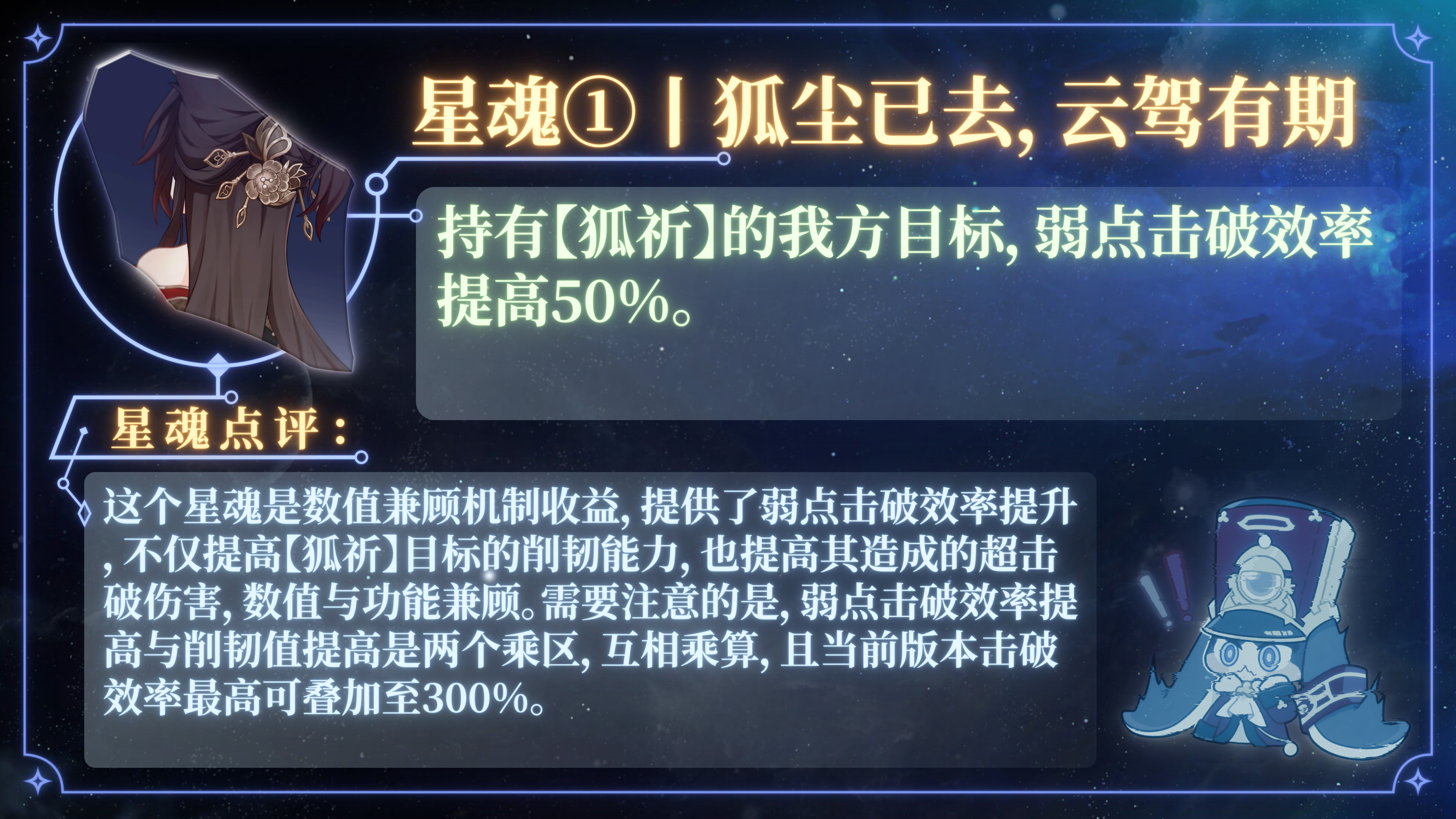 这个星魂是数值兼顾机制收益,提供了弱点击破效率提升,不仅提高【狐祈】目标的削韧能力,也提高其造成的超击破伤害,数值与功能兼顾。需要注意的是,弱点击破效率提高与削韧值提高是两个乘区,互相乘算,且当前版本击破效率最高可叠加至300%。