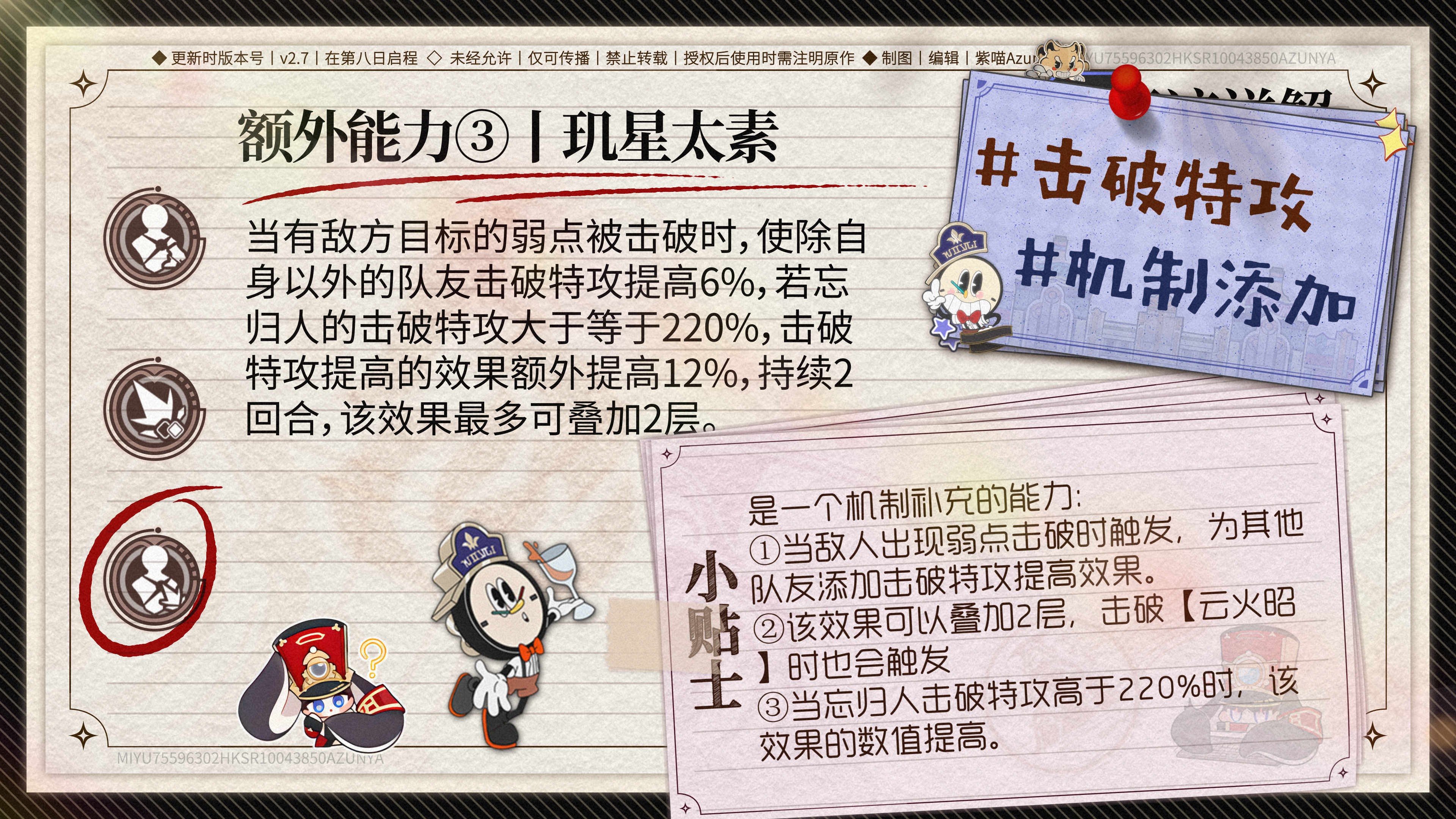 ①当敌人出现弱点击破时触发,为其他队友添加击破特攻提高效果。